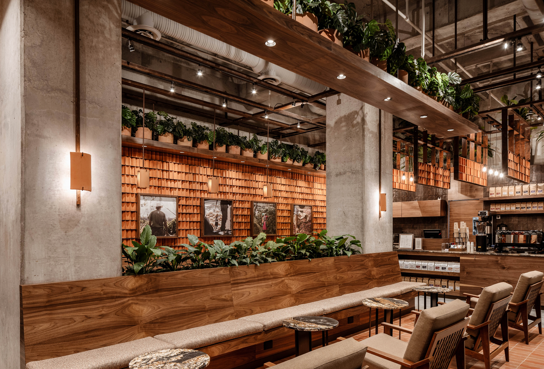 Buscamos ofrecer una experiencia que auténticamente conecte toda la cadena del café, desde las fincas hasta la taza. El diseño fue inspirado en las técnicas de construcción residencial de Chiapas, que utiliza las tejas de barro por su gran resistencia a lluvia y viento. En nuestras sucursales, las tejas de barro no solo ayudan a absorber y desviar el sonido, sino que también se asemejan a los granos de café por su color y forma.